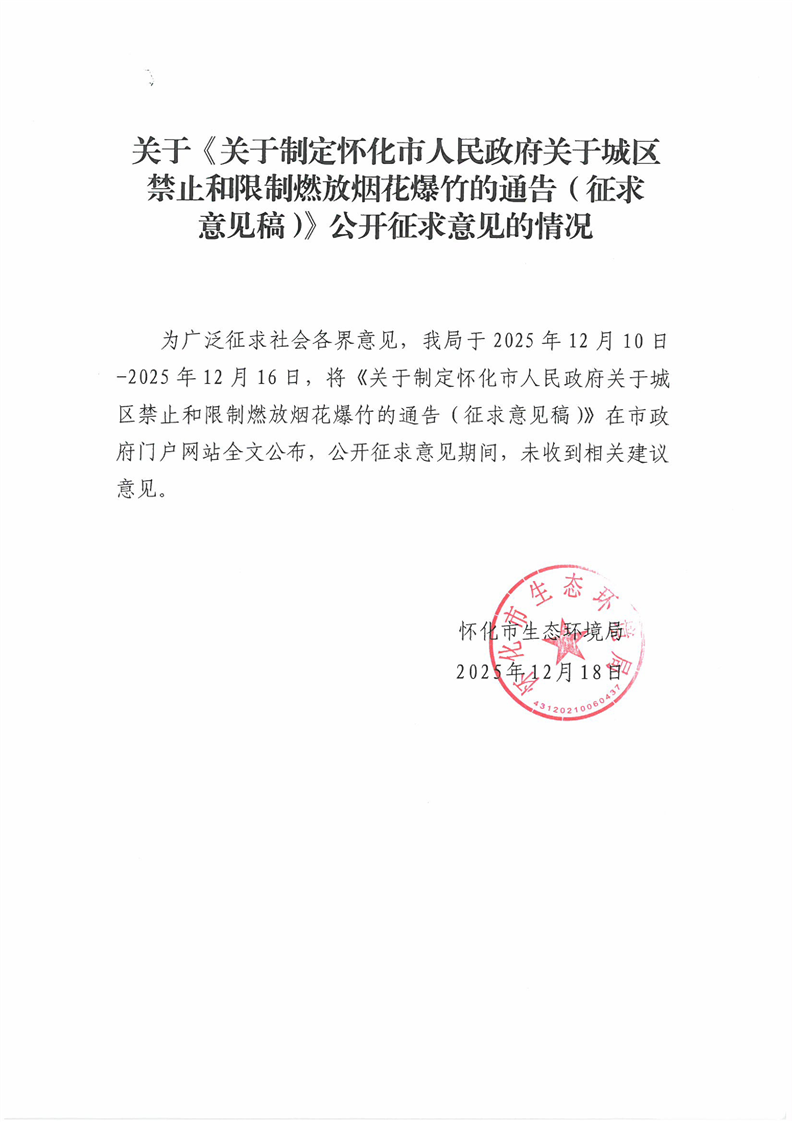 關於《關於城區禁止和限製燃放煙花爆竹的通告(征求意見稿)》公開征求意見的情況