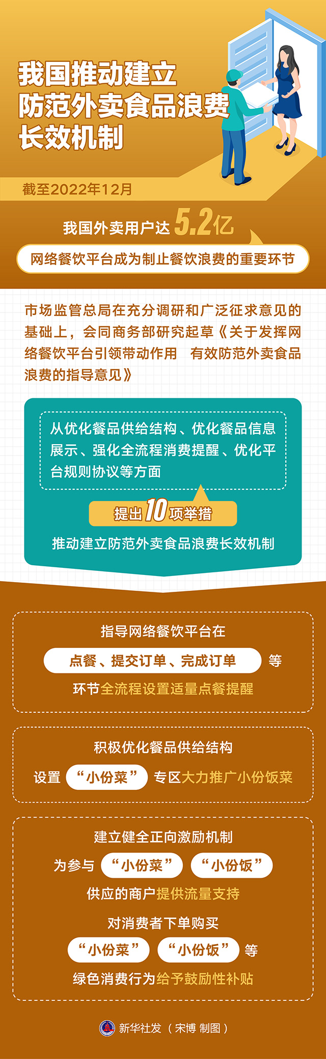 截至2022年12月,我國外賣用戶達5.2億,網絡餐飲平台成為製止餐飲浪費的重要環節。市場監管總局將進一步發揮平台示範引領作用,推動建立防範外賣食品浪費長效機製。