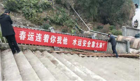 圖13 芷江縣水運事務中心工作人員在重點渡口碼頭顯要位置處懸掛春運安全橫幅