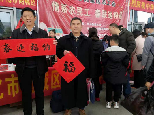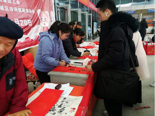 1月20日,懷運集團工會聯合鶴城區詩詞楹聯協會在懷化綜合客運樞紐站開展“情係農民工,春聯送祝福”活動。
