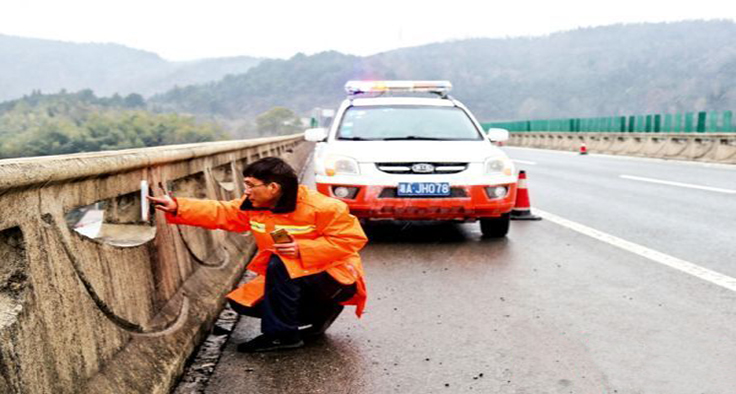 12月29日,高速公路懷化管理處養護人員在G65舞水大橋查看橋梁溫度,確保車輛安全通行。(本報記者 潘雨 通訊員 曹莉 攝)