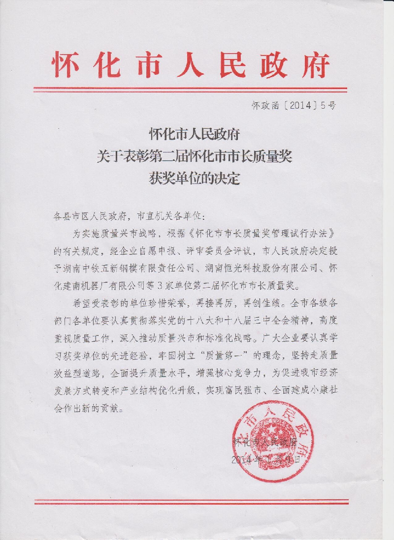 自2011年頒發首屆懷化市市長質量獎以來,全市各級各部門,各企業迅速掀起了質量興市熱潮,廣泛開展了學習貫徹落實以《卓越績效評審準則》國家標準和市內外先進企業成功質量管理經驗為重點的質量強市活動,我市質量工作得到了很好的發展,為進一步推進質量興市戰略,2013年我市根據《懷化市市長質量獎試行管理辦法》的有關規定,經企業自願申報、評審委員會評議,市人民政府決定,授予湖南中鐵五新鋼模有限責任公司、湖南恒光科技股份有限公司、懷化建南機器廠有限公司等3家單位第二屆懷化市市長質量獎。