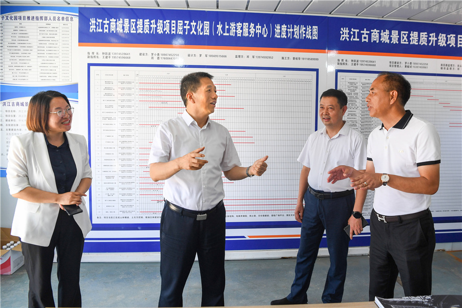 (許忠建在洪江古商城了解屈子江閣、水上遊客服務中心等景區提質改造項目進展情況。以上照片均由懷化日報全媒體記者 楊智偉 攝)