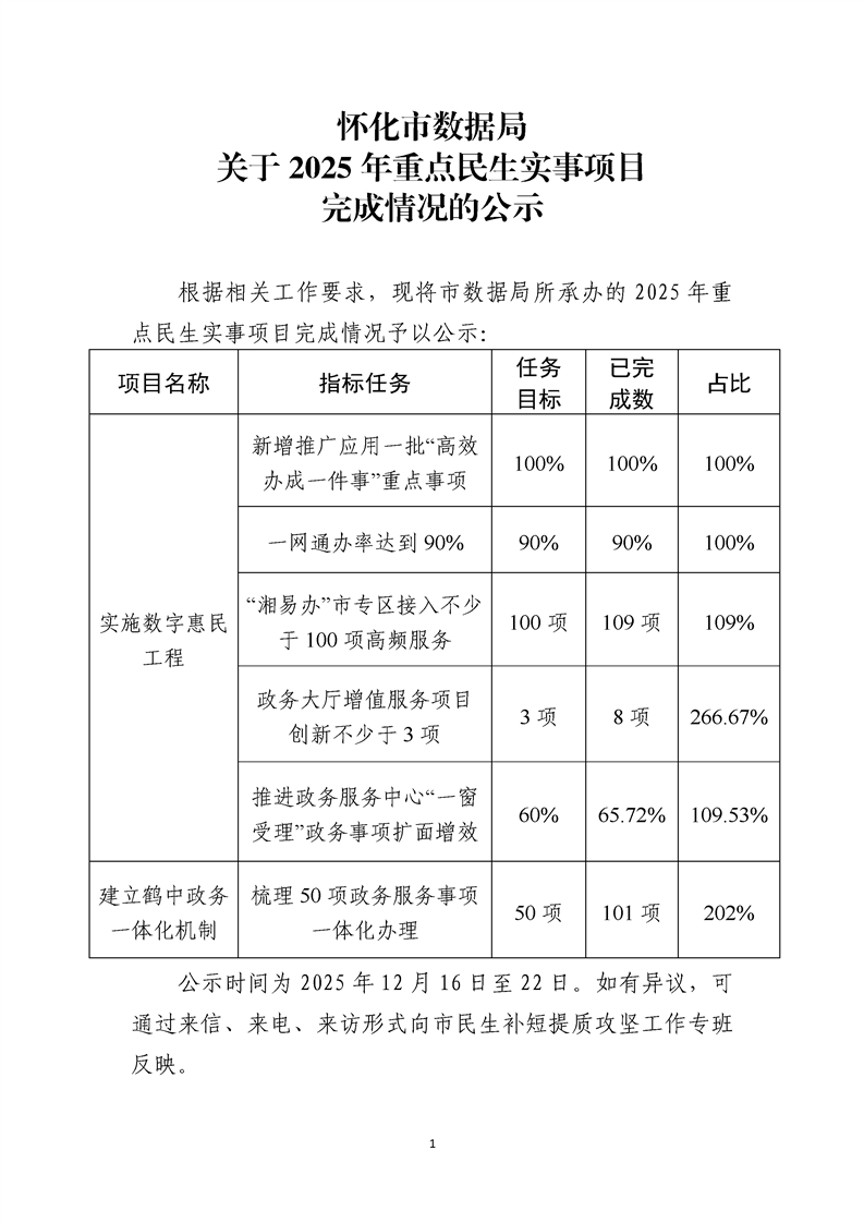 懷化市數據局關於2025年重點民生實事項目完成情況的公示