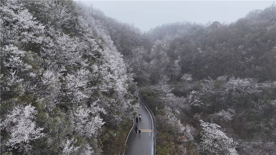此次降雪後,索道沿線山林盡染素白,霧凇晶瑩,雲海翻湧,遊客乘索道淩空而行,30分鍾內便可俯瞰層巒疊嶂間冰裹樹梢、雪覆梯田的奇景。尤其在清晨陽光映照下,冰晶折射出璀璨光芒,仿若步入琉璃世界。
