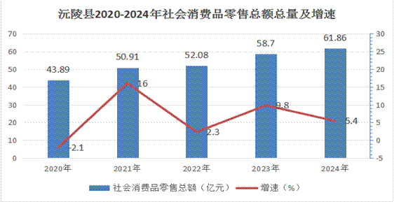 全縣完成社會消費品零售總額61.86億元[4],同比增長5.4%。全年居民消費價格指數(CPI)為100.2%;服務項目價格指數為100.2%。