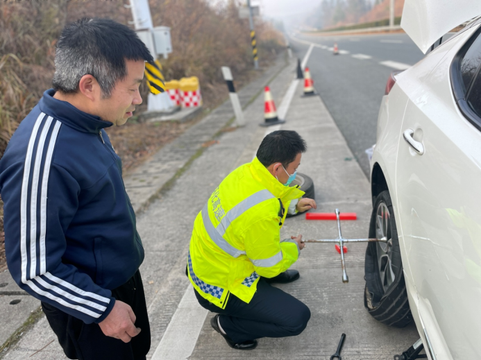 春運第一天,高速公路上車流量明顯增加,懷化西管理所巡查人員江揚、於楓起了個大早,開始了一天的巡查工作。9時許,巡查至G65包茂高速懷化段K2187南往北時,發現一輛小車因右後輪爆胎停在緊急停車帶。由於駕駛員沒有換胎經驗,正焦急地站在車旁,手足無措。巡查人員了解情況後,立即用隨車維修工具幫助司機更換輪胎,不到5分鍾就將備胎換上,幫助駕駛員再次踏上旅途。