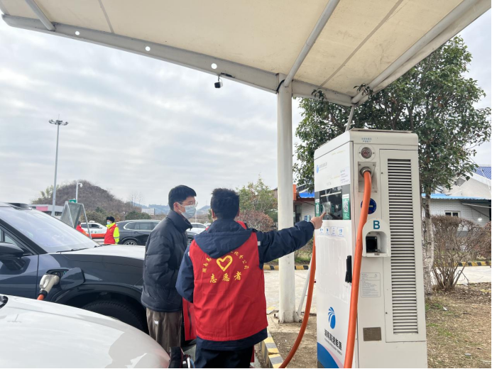 大年初三,外出旅遊獲探親訪友的車輛越來越多,考慮到許多司乘人員對充電樁使用生疏,為更好服務司乘朋友,縮短排隊充電時間,新晃片區管理所“路燈”誌願者們一早來到新晃服務區,在電動車充電樁處設置服務台,對前來充電的司乘人員進行教學示範,保障其快速充電,並送上新年祝福。