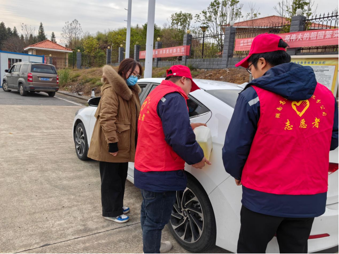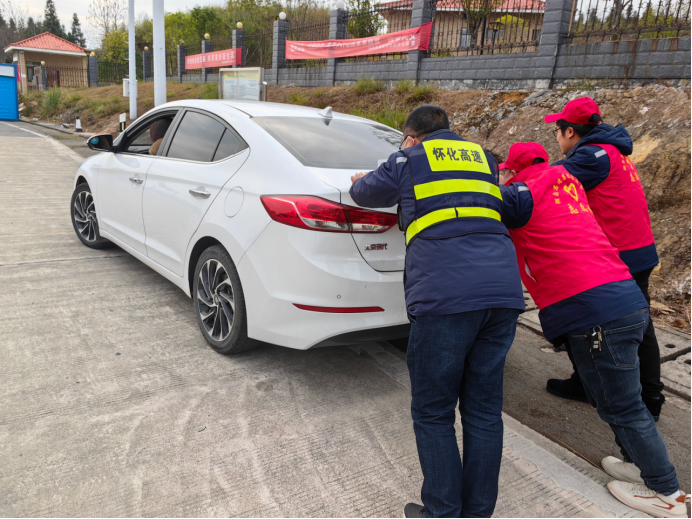 大年初二,在江市收費站,一輛小轎車因燃油耗盡,無法啟動。由於身處異地司機臉上寫滿了焦慮與不安。收費站工作人員發現司機的難處後, 合力把車推至收費廣場安全區域。隨後帶駕駛員到附近加油站購買汽油,並幫助司機加上汽油,重新踏上旅途。