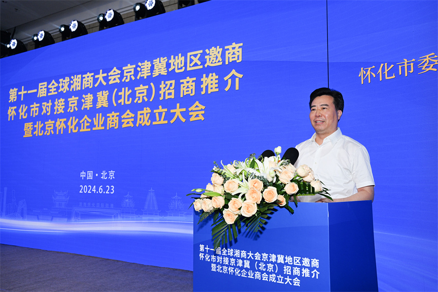 6月23日下午,第十一屆全球湘商大會京津冀地區邀商、懷化市對接京津冀(北京)招商推介暨北京懷化企業商會成立大會在北京舉行。原國家工商總局局長、湖南省政府原省長周伯華,第十一屆全國政協提案委員會副主任、北京市政協原主席陽安江,中央紀委駐最高人民檢察院紀檢組原組長莫文秀,國務院原參事、國家發改委原副主任徐憲平,西部戰區原副政委兼西部戰區空軍政委舒清友,省政府駐京辦事處黨組書記、主任陳榮偉出席。市委副書記、市長黎春秋為北京懷化企業商會名譽會長、會長單位授牌。省工商聯黨組成員、副主席謝商文主持。