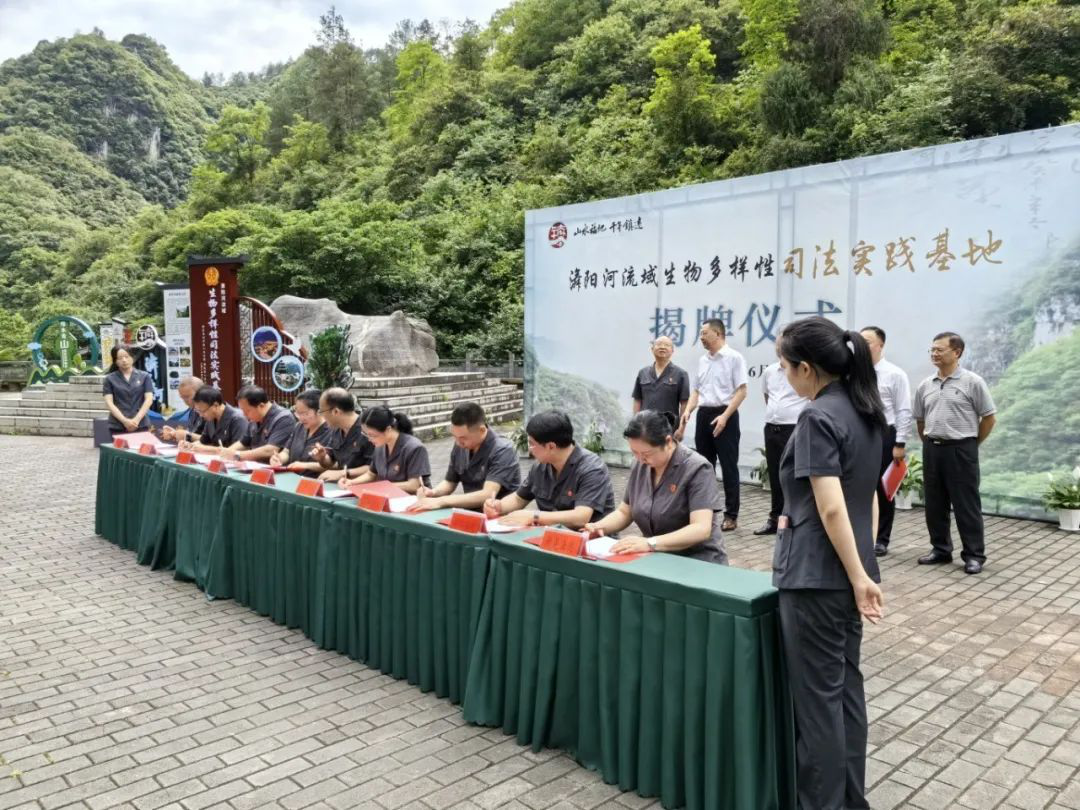6月5日是世界環境日,新晃縣人民法院黨組書記、院長楊琳慧帶隊與貴州省鎮遠縣、甕安縣、黃平縣、施秉縣、岑鞏縣、玉屏侗族自治縣、銅仁市碧江區人民法院在貴州省鎮遠縣下㵲陽河景區遊客服務中心廣場開展“㵲陽(水)河流域生物多樣性司法實踐基地”揭牌活動,並共同簽署了《㵲陽(水)河全流域環境資源跨省州縣司法保護協作機製》。