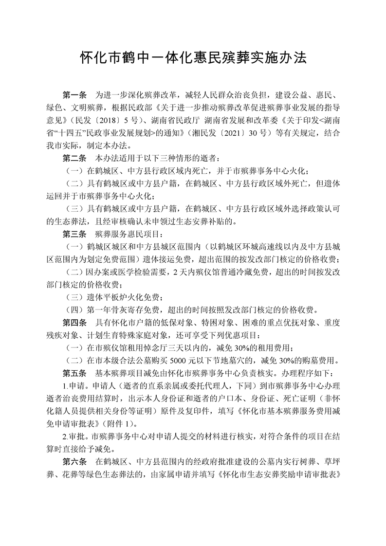 關於印發《懷化市鶴中一體化惠民殯葬實施辦法》的通知