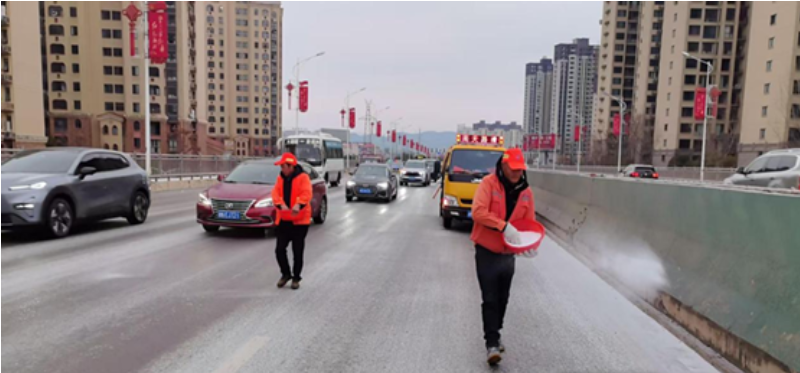 養護工人們身著醒目的橙色反光工作服,不畏嚴寒,有的揮舞著鐵鍬、掃帚清理冰層,有的手持工具拋灑融雪劑,他們爭分奪秒,全力清除橋麵冰雪,確保車輛能夠安全通行。經過緊張的作業,橋麵冰層被迅速清除,有效預防了因路麵濕滑引發的交通事故。
