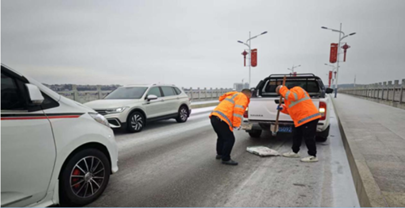 公路養護人員在漵浦二橋拋灑融雪劑進行除冰作業