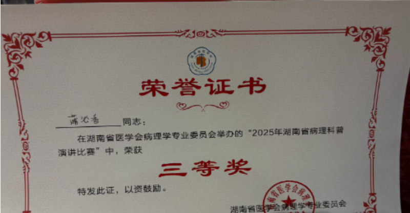 在追求高效、速成的時代,一份看似“姍姍來遲”的病理報告背後,究竟承載著怎樣的重量與堅守?近日,在湖南省醫學會病理學專業委員會2025年學術年會科普比賽中,漵浦縣人民醫院病理科蒲必香醫生主創的科普作品《病理報告為什麽要等這麽久》從眾多參賽作品中脫穎而出,榮獲大賽“三等獎”。這份榮譽不僅是對作品深入淺出、精準科普的肯定,更是對醫院病理科數十年如一日專業精神與技術實力的高度認可。