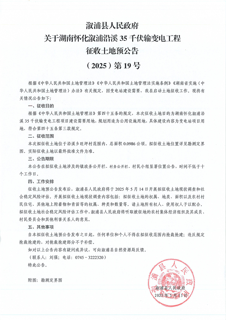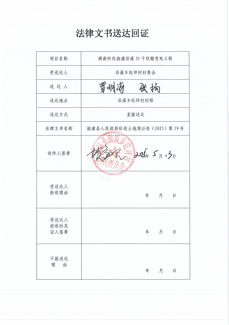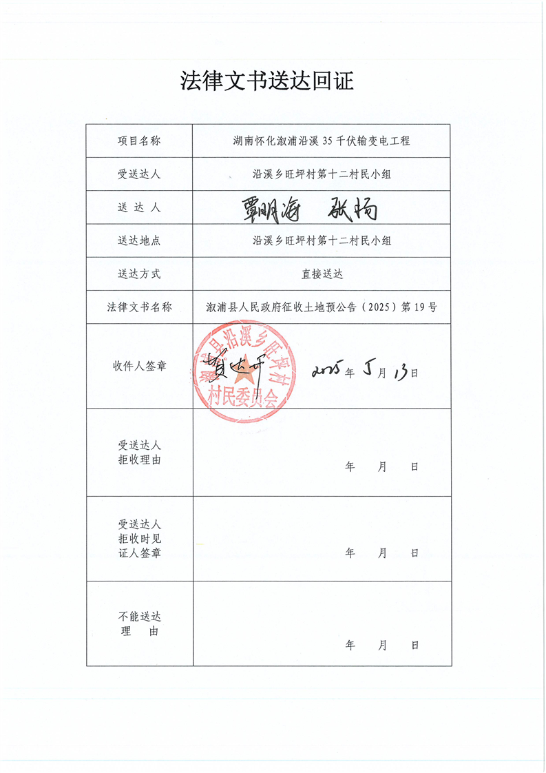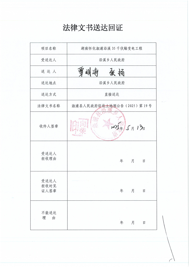 湖南懷化漵浦沿溪35千伏輸電變電工程 擬征地公告及送達回證