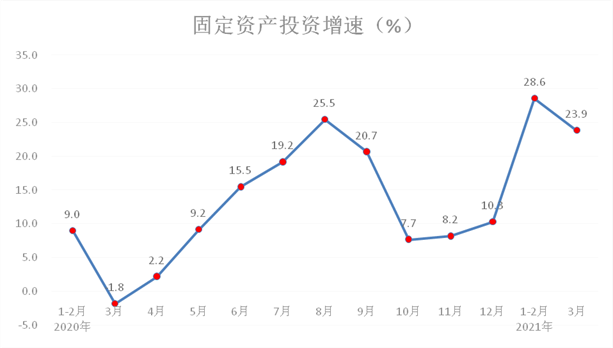 4.固定資產投資。一季度,全社會固定資產投資同比增長23.9%,高於年初目標13.4個百分點 。