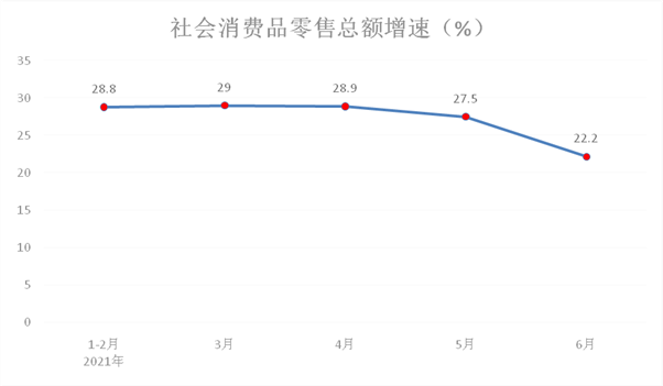 5.社會消費品零售總額。上半年,全縣社會消費品零售總額完成34.1億元,同比增長22.2%,高於年初目標11.7個百分點,低於全市平均水平3.8個百分點。