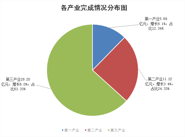 1.地區生產總值。一季度,全縣實現地區生產總值46.11億元,同比增長5.7%,增幅比上年同期下降9.9個百分點,低於年初目標2.3個百分點。其中:第一產業實現增加值5.69億元,增長8.1%;第二產業實現增加值11.22億元,增長3.4%;第三產業實現增加值29.20億元,增長6.0%。產業結構不斷調整,產業結構構成由上年同期的13.6%、23.6%和62.8 %調整為12.4%、24.3%和63.3 %。