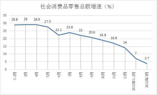 5.社會消費品零售總額。一季度,全縣社會消費品零售總額完成19.2億元,同比增長3.7%,差年度增速目標6.8個百分點。