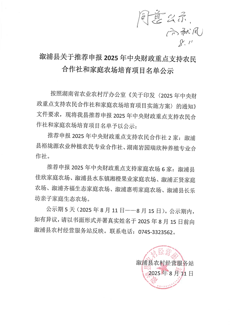 漵浦縣關於推薦申報2025年中央財政重點支持農民合作社和家庭農場培育項目名單公示