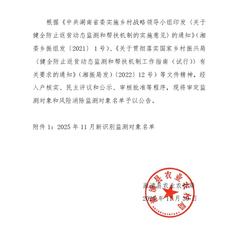 漵浦縣2025年11月份新納入和風險消除監測對象公告