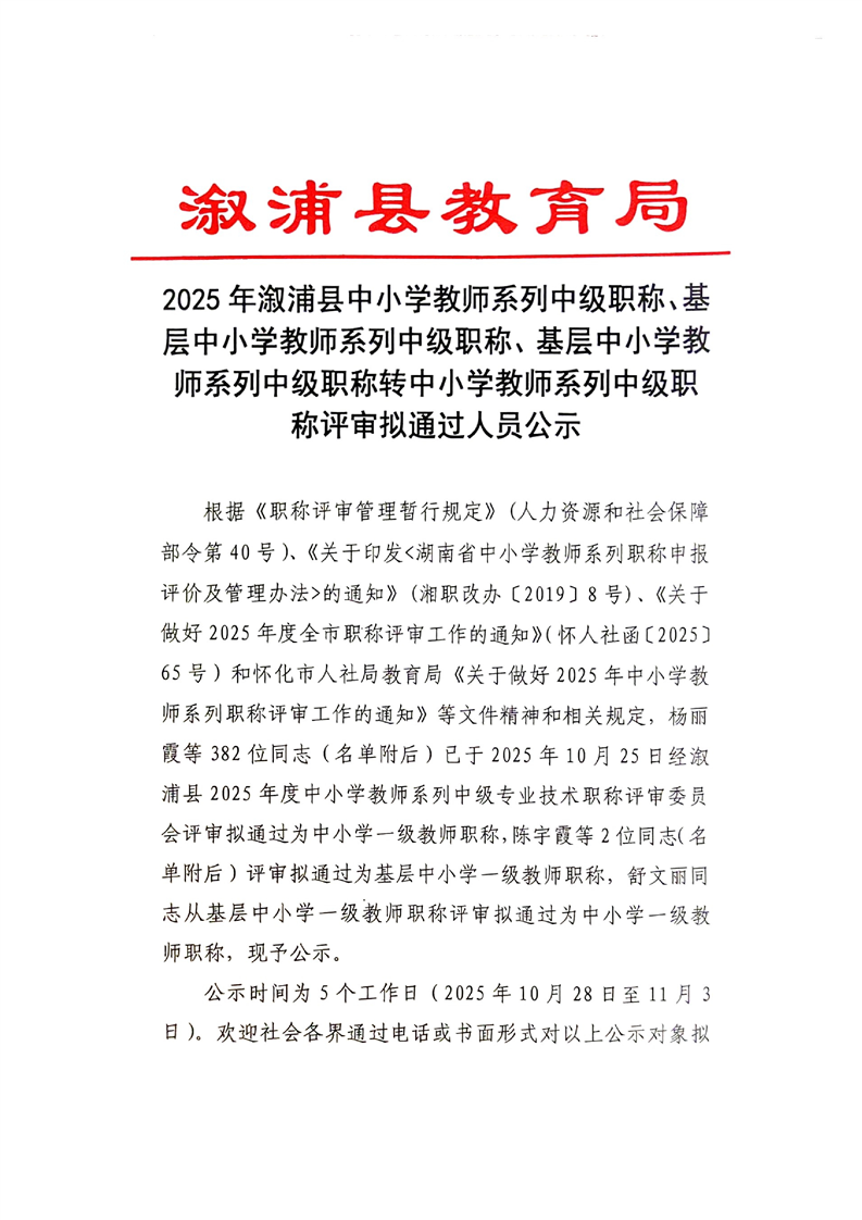 2025年漵浦縣中小學教師係列中級職稱、基層中小學教師係列中級職稱、基層中小學教師係列中級職稱轉中小學教師係列中級職稱評審擬通過人員公示