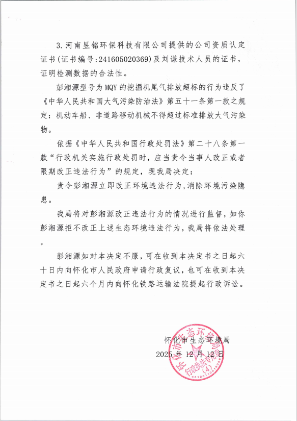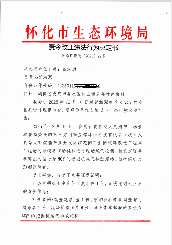 彭湘源:違反《中華人民共和國大氣汙染防治法》責令改正違法行為決定書