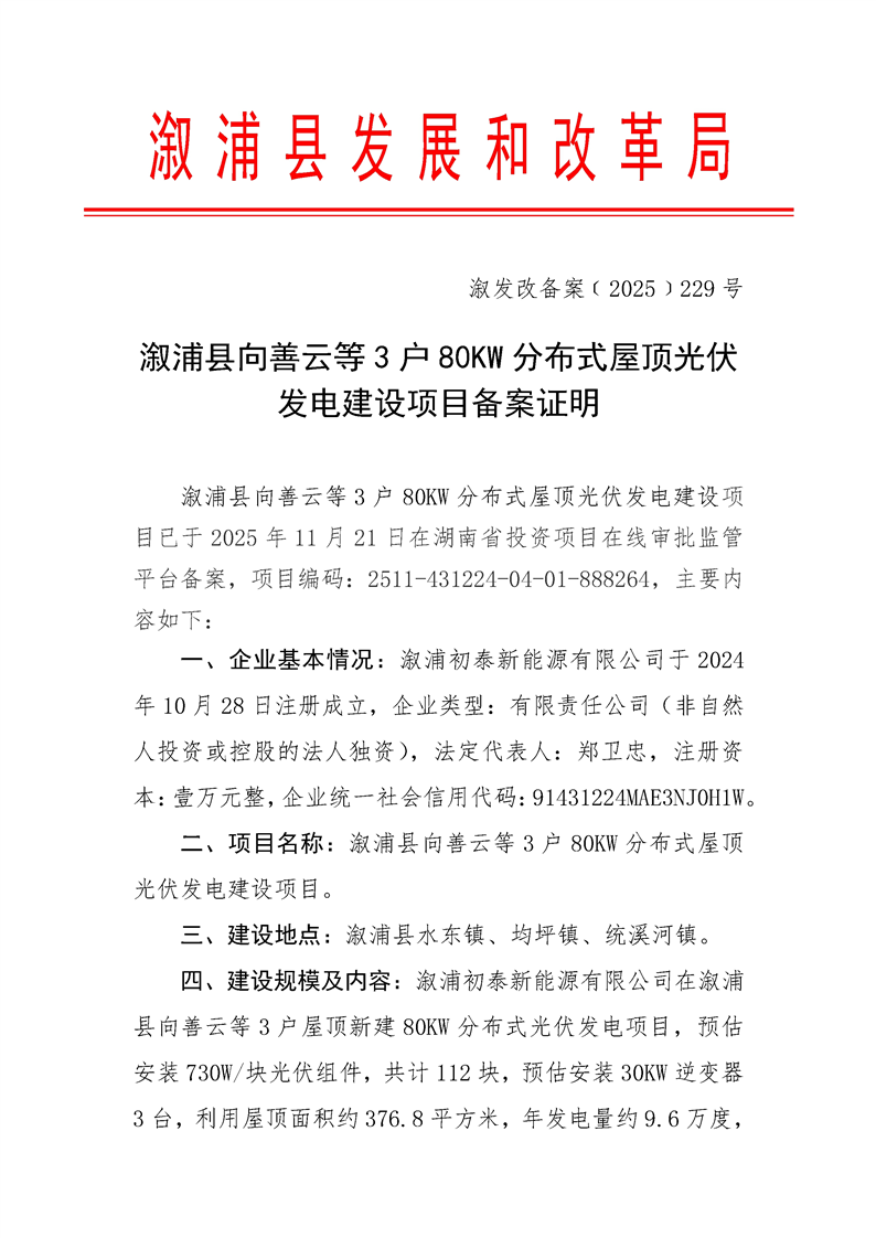 漵浦縣向善雲等3戶80KW分布式屋頂光伏發電建設項目