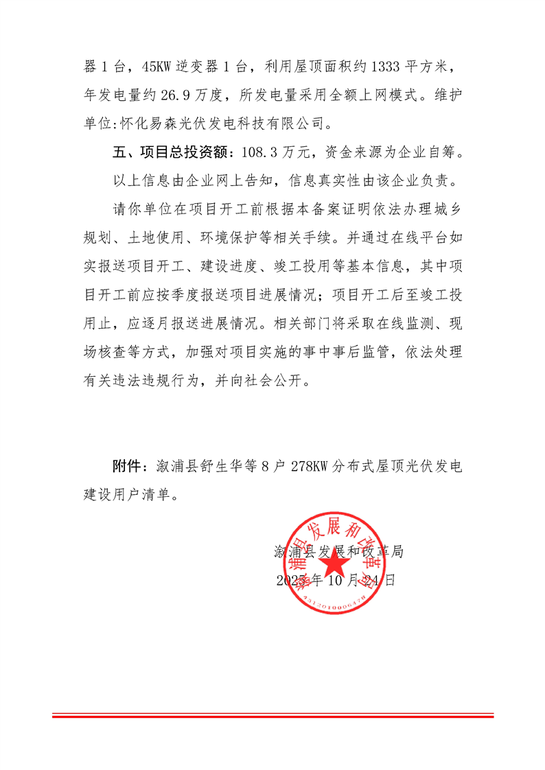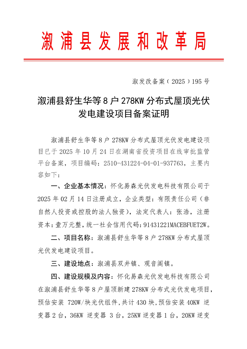 漵浦縣舒生華等8戶278KW分布式屋頂光伏發電建設項目