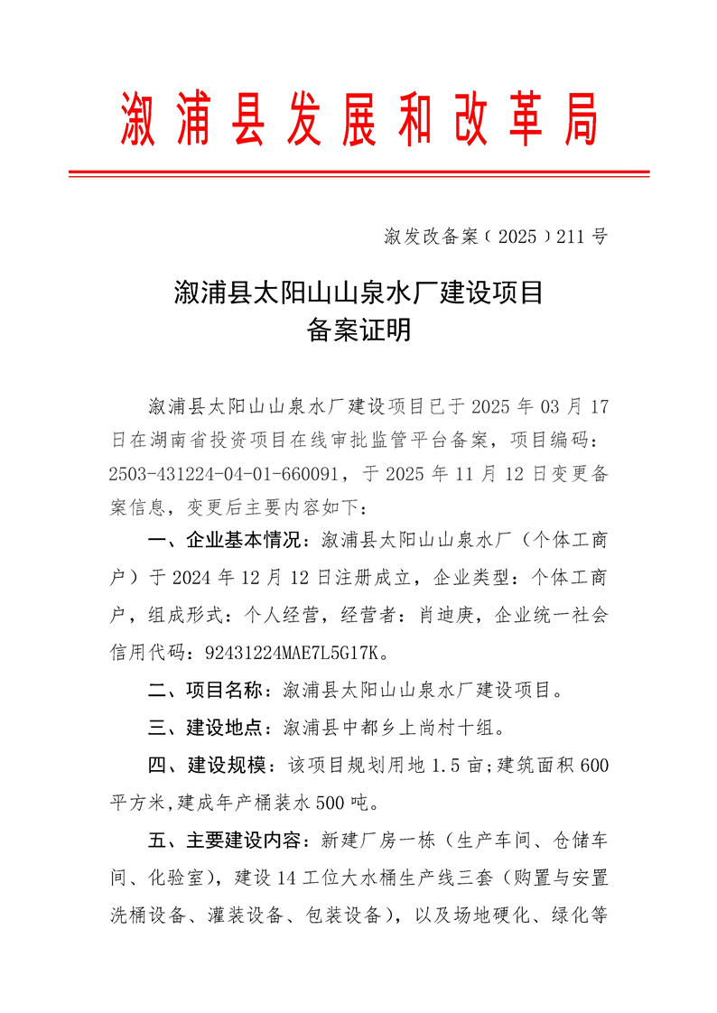 漵浦縣太陽山山泉水廠建設項目備案證明
