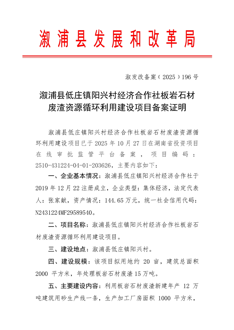 漵浦縣低莊鎮陽興村經濟合作社板岩石材廢渣資源循環利用建設項目備案證明