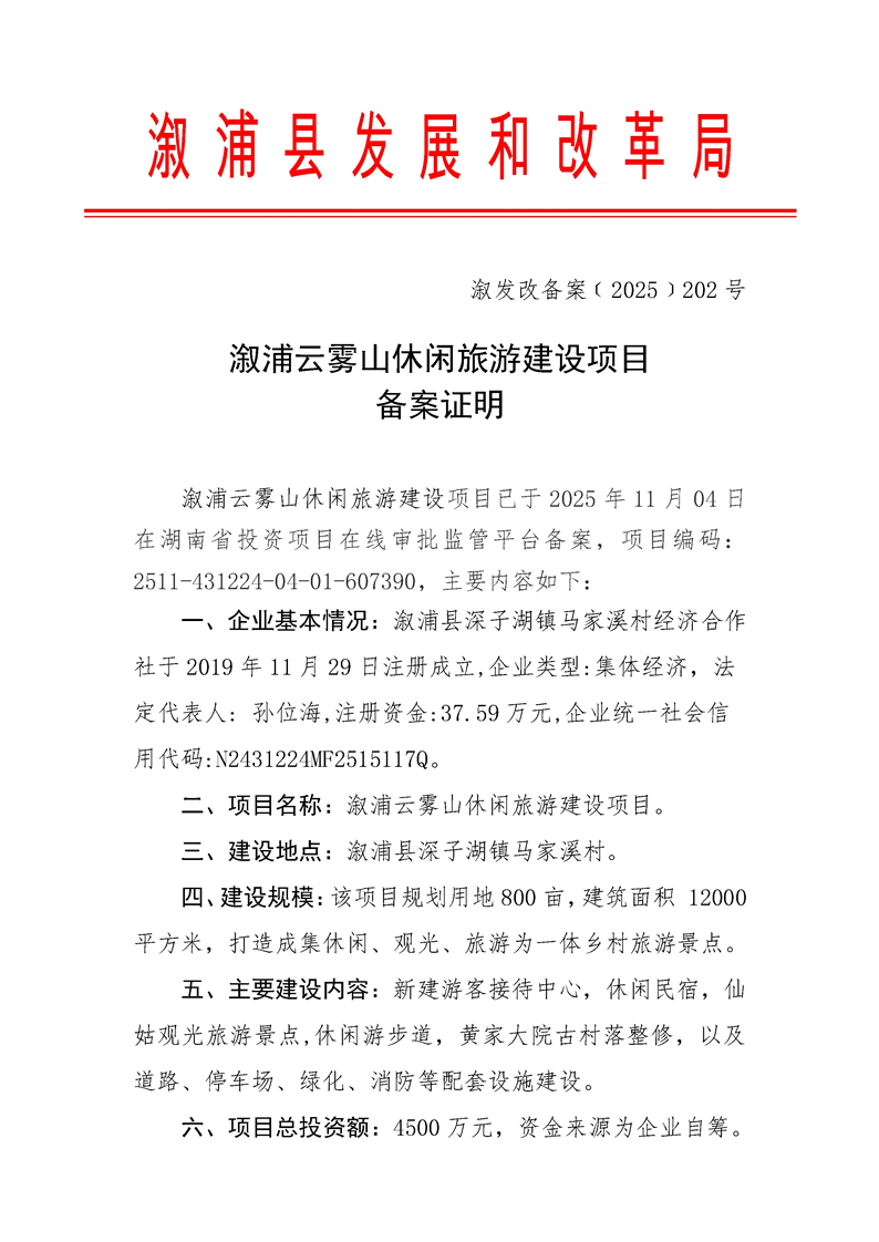 漵浦雲霧山休閑旅遊建設項目備案證明