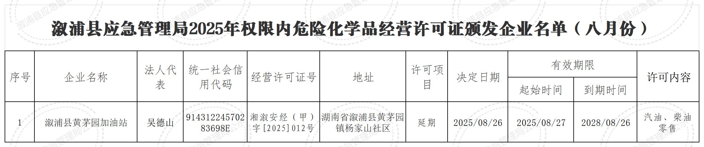 漵浦縣應急管理局2025年權限內危險化學品經營許可證頒發企業名單(八月份)