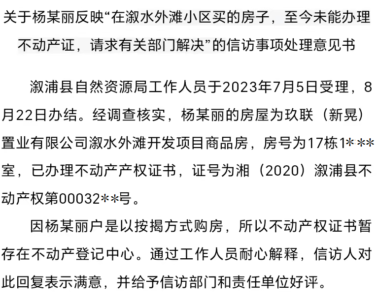 關於楊某麗反映“在漵水外灘小區買的房子,至今未能辦理不動產證,請求有關部門解決”的信訪事項處理意見書