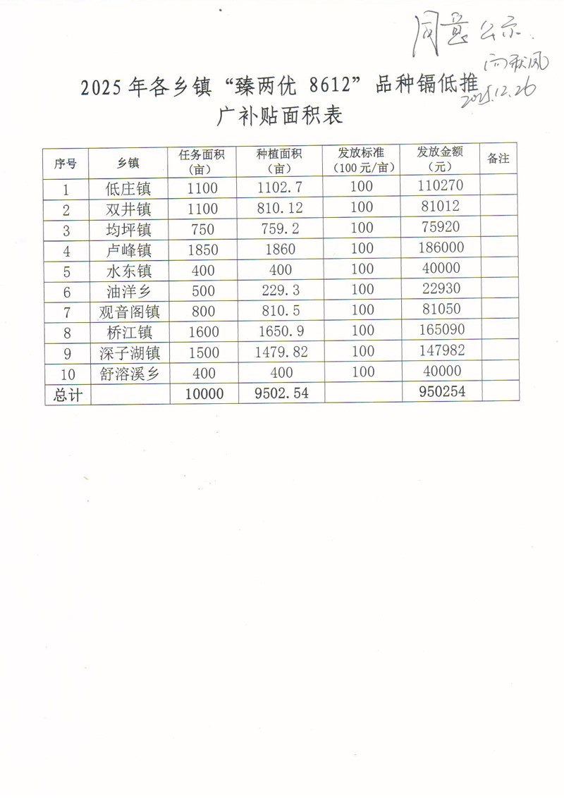 2025年度各鄉鎮“臻兩優8612”品種鎘低推廣補貼麵積表