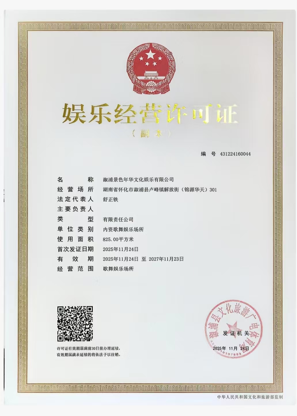 娛樂經營許可證---漵浦景色年華文化娛樂有限公司