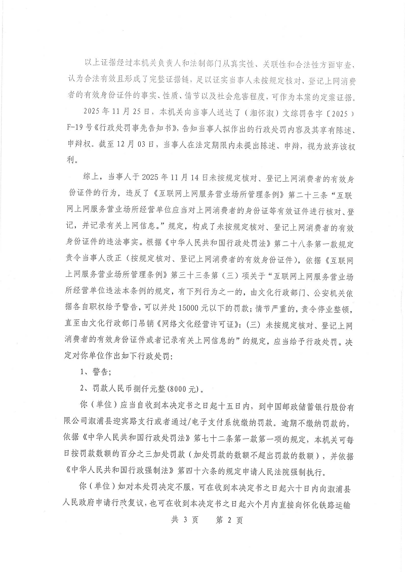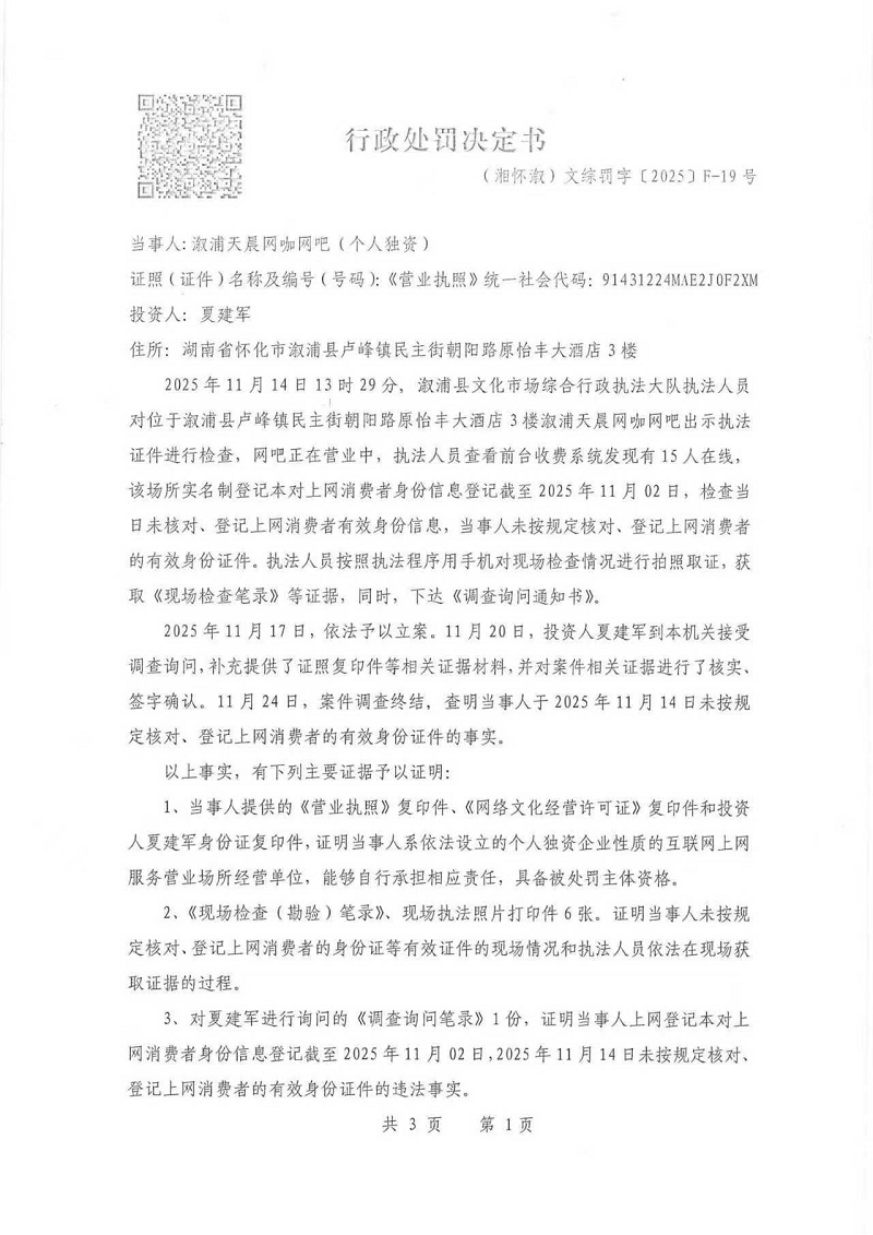 行政處罰決定書--漵浦天晨網咖網吧(湘懷漵)文綜罰字 〔2025〕F-19號
