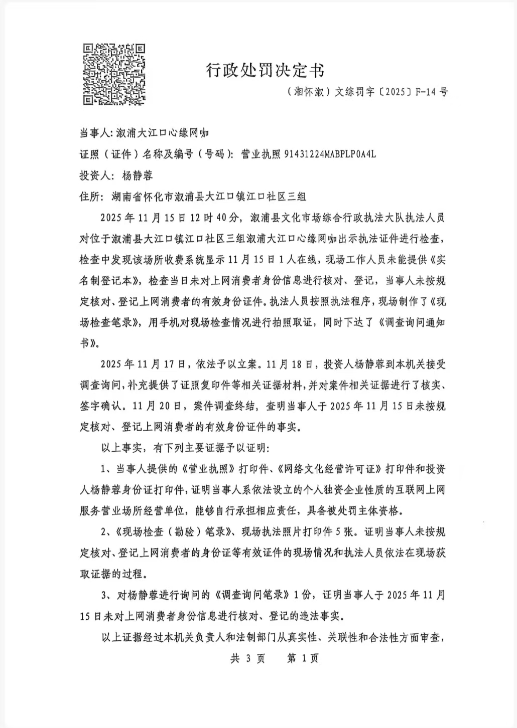 行政處罰決定書--漵浦縣大江口心緣網咖 (湘懷漵)文綜罰字 〔2025〕F-14號
