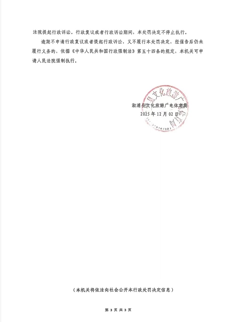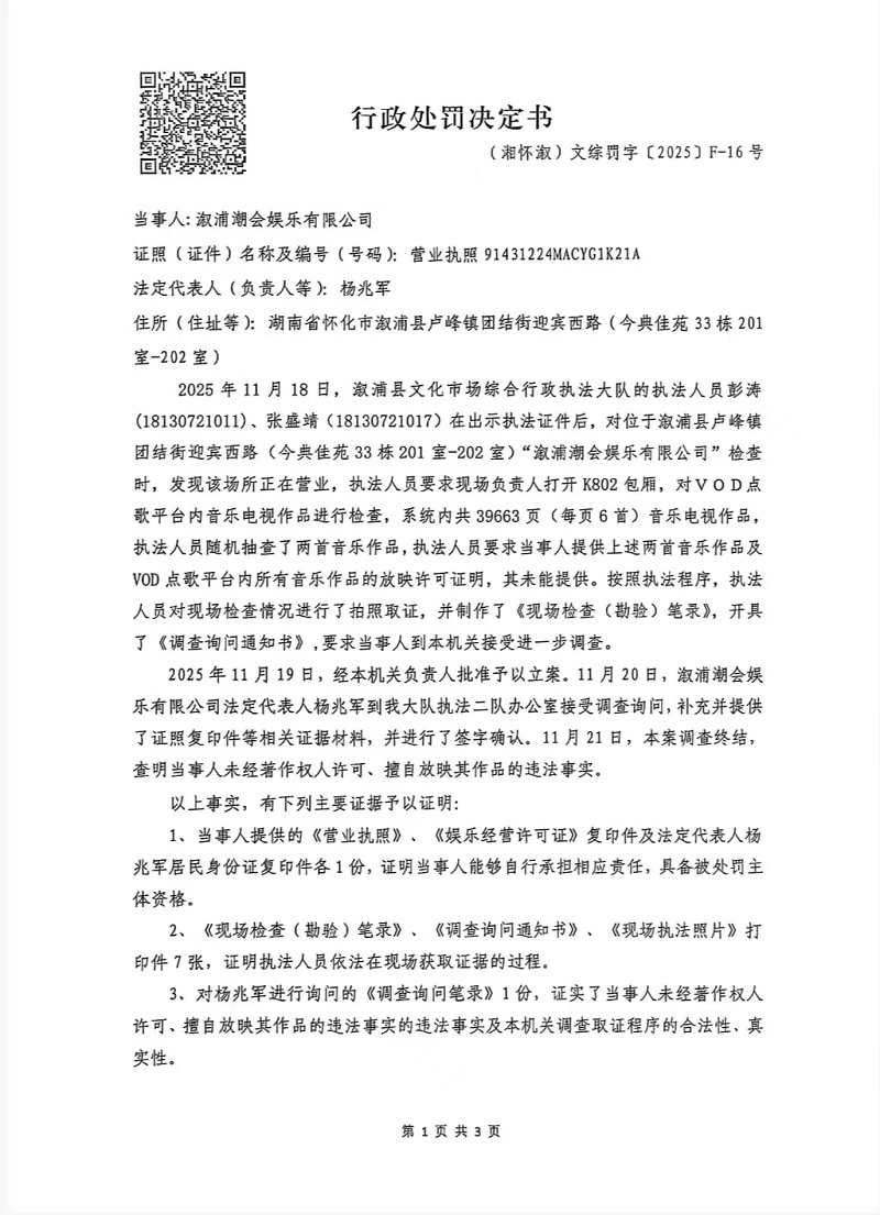 行政處罰決定書--漵浦潮會娛樂有限公司 (湘懷漵)文綜罰字 〔2025〕F-16號